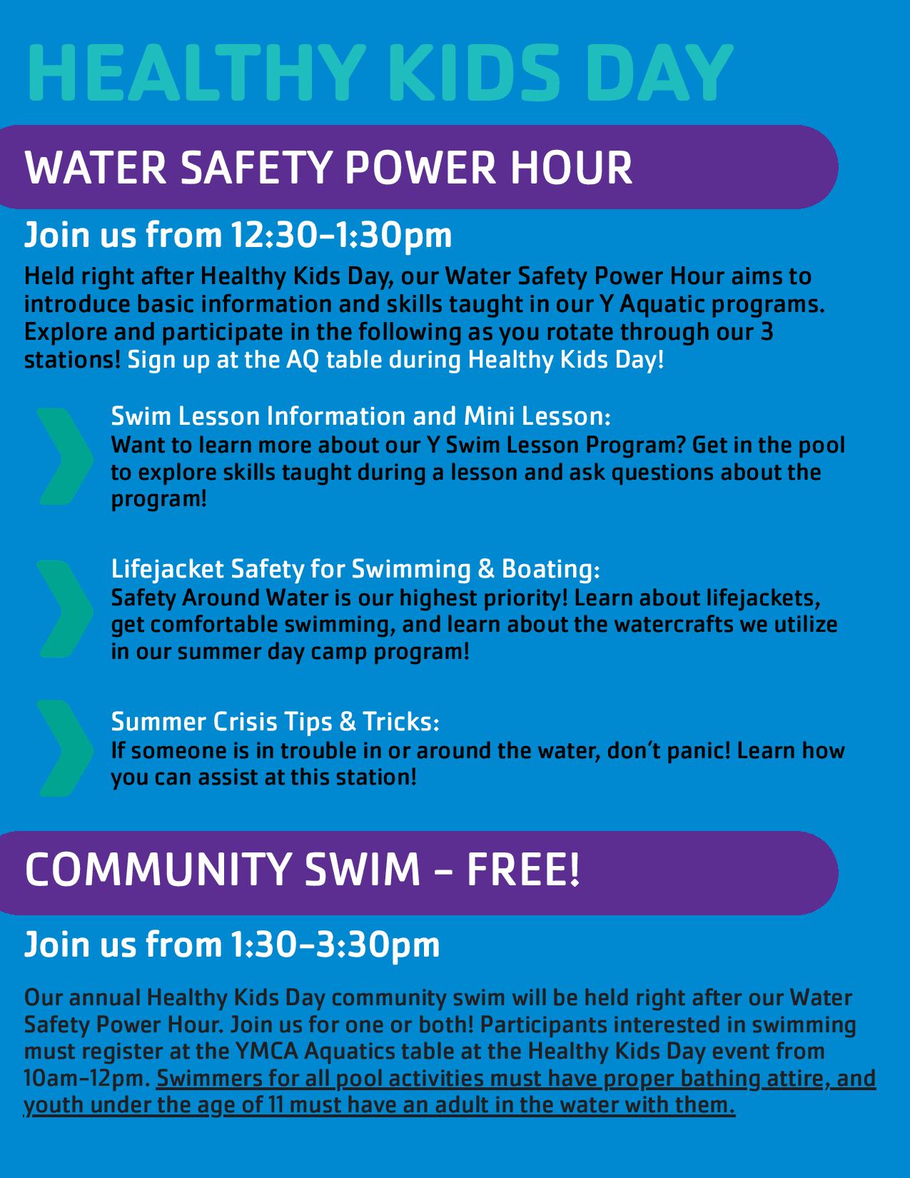 Join us from 10am-12pm at the YMCA for our annual FREE community event! Games, inflatables, resource tables and more - stop by! And don't forget about our Water Safety "POWER HOUR" and Community Swim, beginning at 12:30pm.