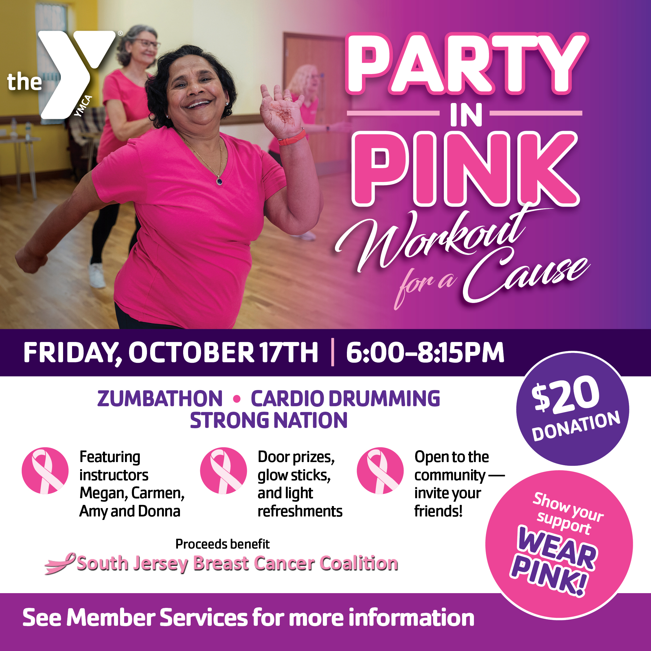 Join us for a night filled with music, movement and mission! Our first every "Party In Pink" will feature a variety of group exercise classes with your favorite YMCA Instructors for Breast Cancer Awarness Month. A $20.00 donation is recommended to join the fun and a portion of proceeds will be donated to the South Jersey Breast Cancer Coalition.